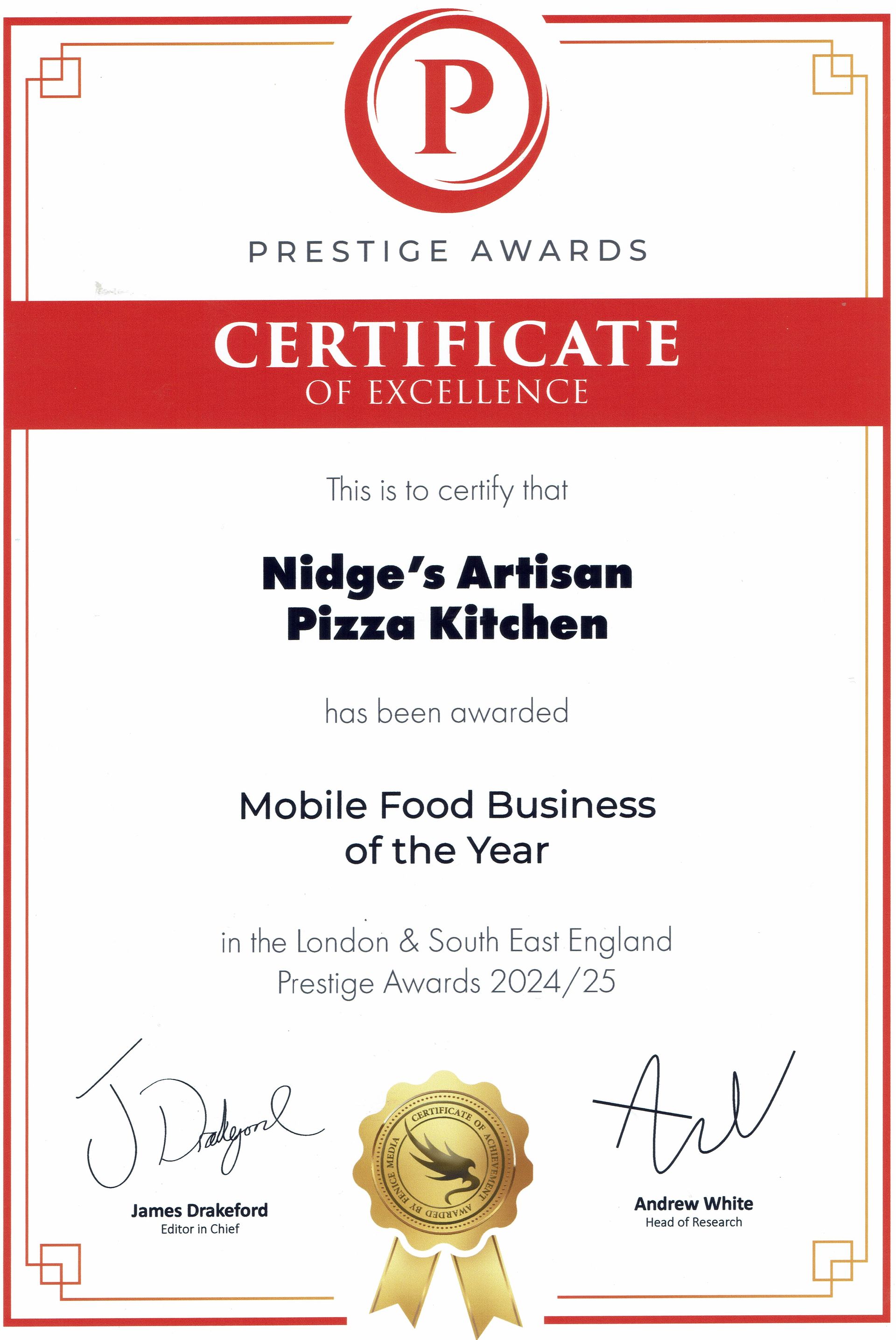 We’re absolutely thrilled to announce that Nidge’s Artisan Pizza Kitchen has been named Takeaway & Mobile Food Business of the Year at the South England Prestige Awards — for the second year in a row!