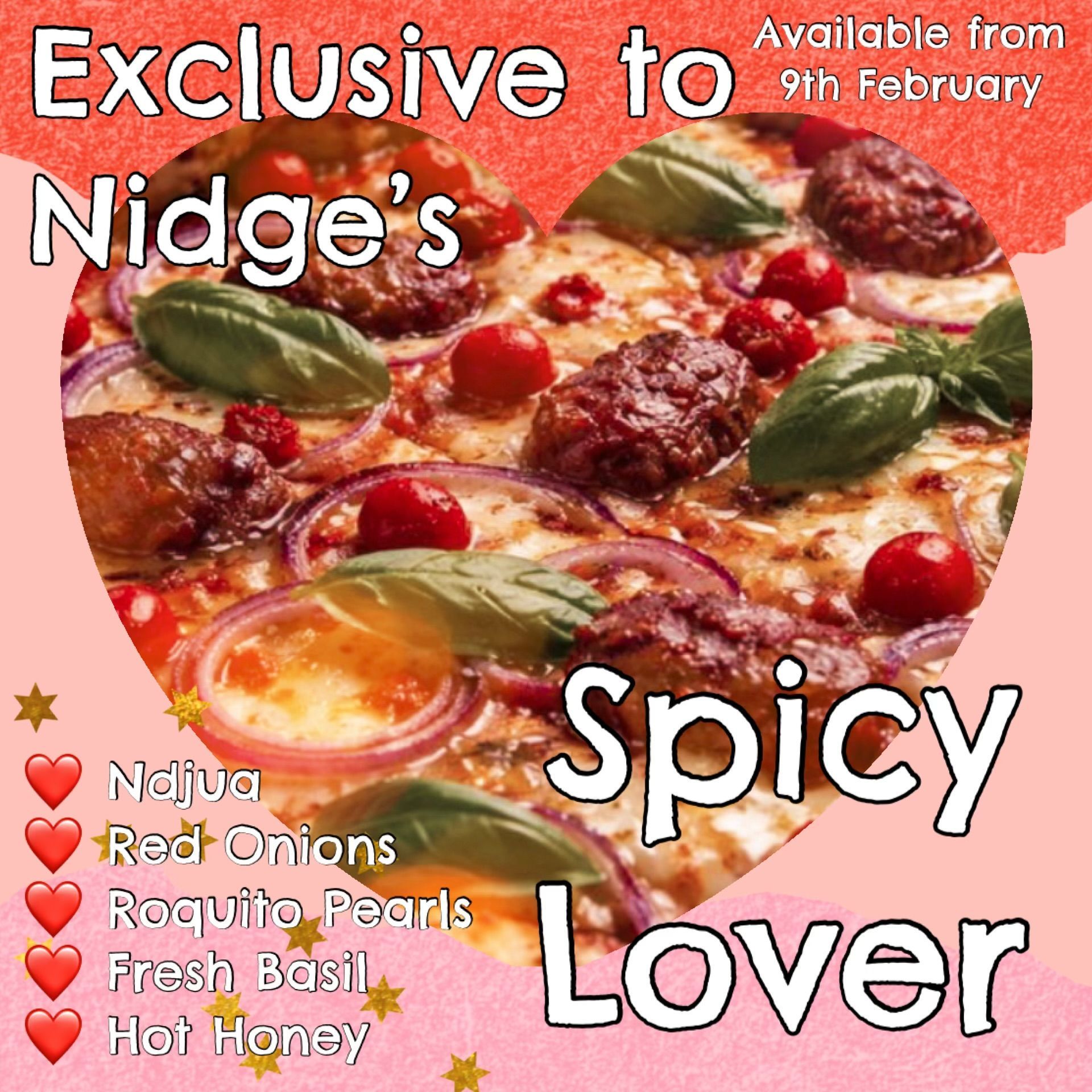 "THE SPICY LOVER" Ndjua, Roquito Pearls, Red Onions, Fresh Basil and a Hot Honey Drizzle